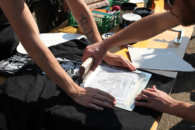 If you are interested in learning how to print on textiles, just come along and visit our screen-printing workshop. Pick your favourite motif, we guide you through the process. No previous knowledge necessary. Bring your own stuff or choose from our shirts and bags (while stocks last).